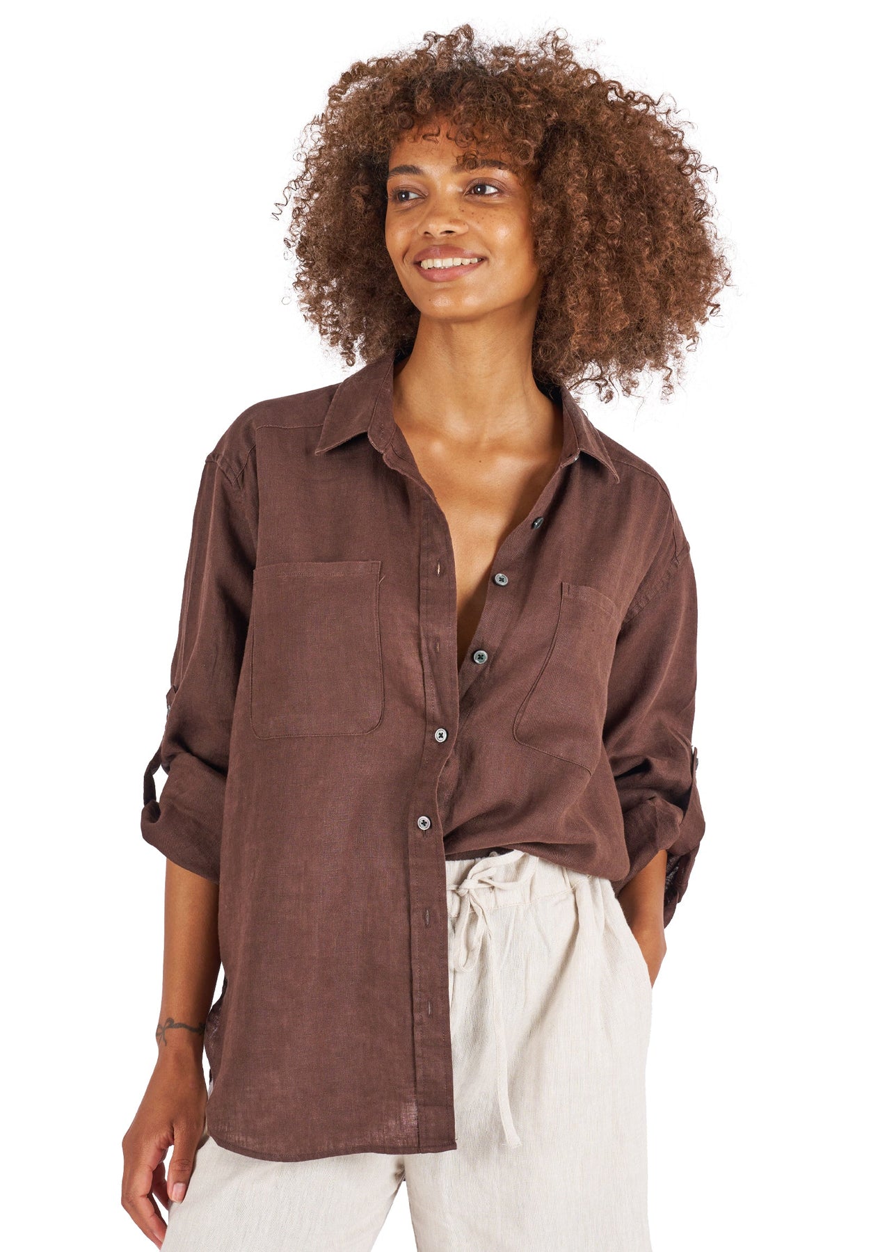 Luna Coffee Oversized Linen Shirt with Pockets
