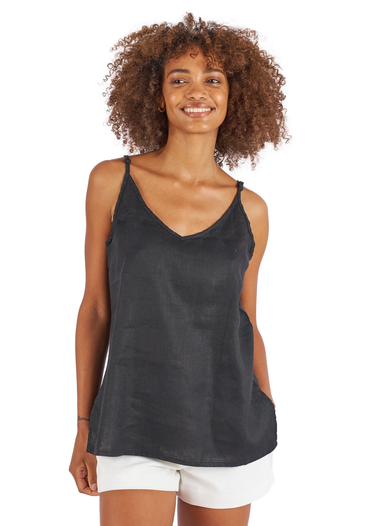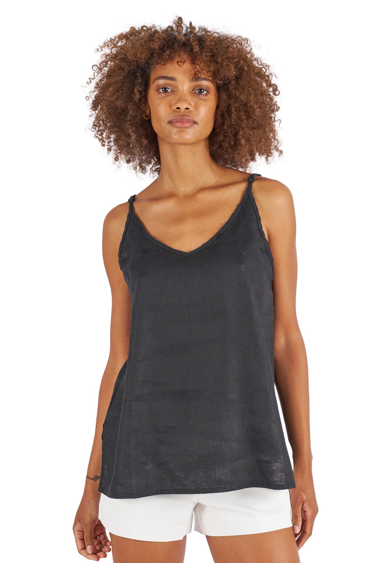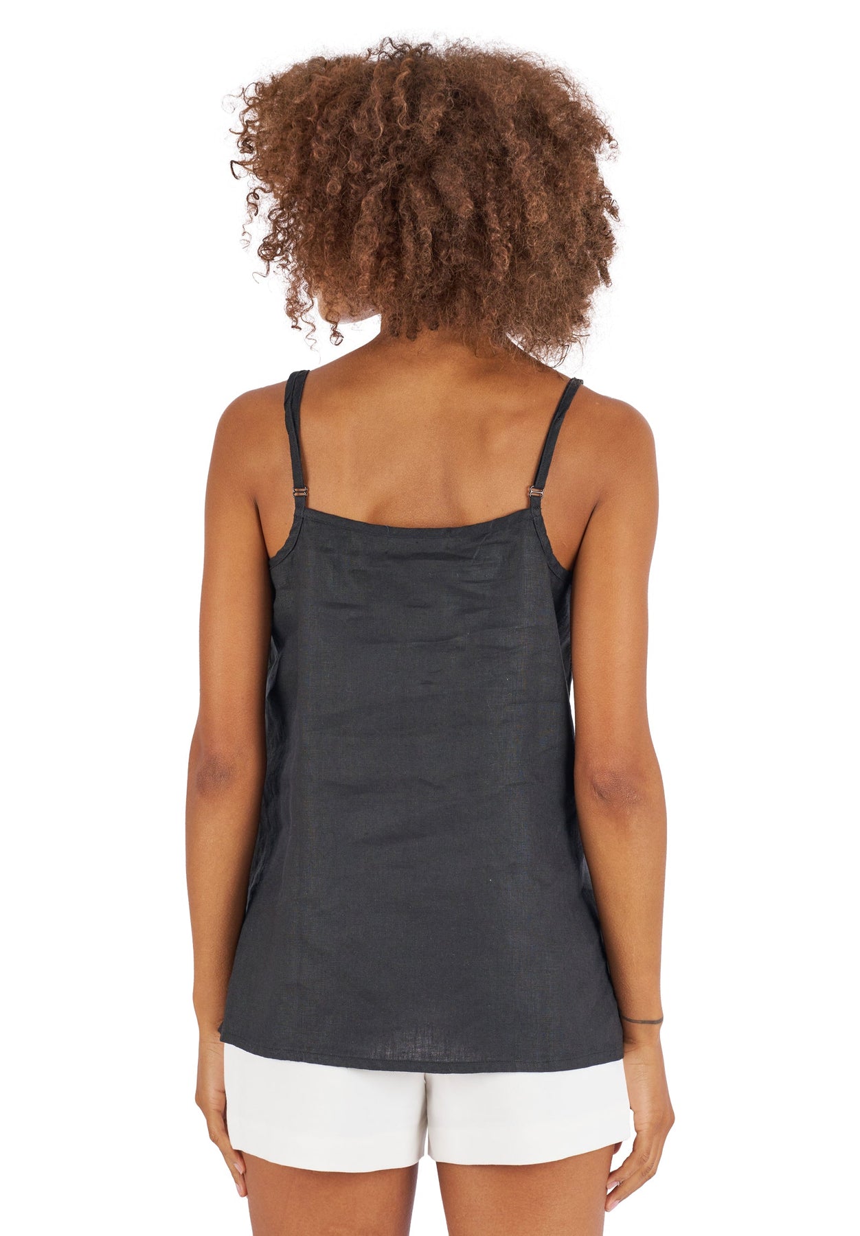 'Cami V Black' linen camisole top with spaghetti adjustable straps