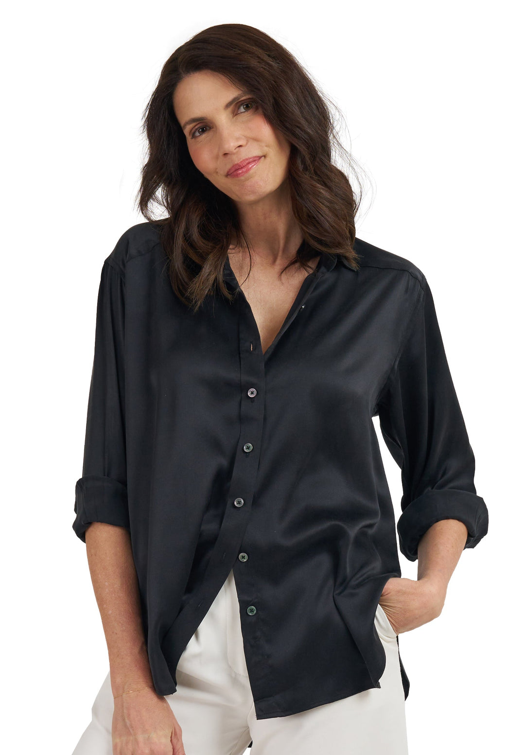 Don't be basic. Step up your game with this sleek and luscious Soie Black Oversized Satin Silk Shirt. Perfectly oversized and made with 100% silk charmeuse, this shirt is like a cloud with style – you'll feel like you're wearing a cloud (Which might just be the *extra* flair you need to make a statement!)