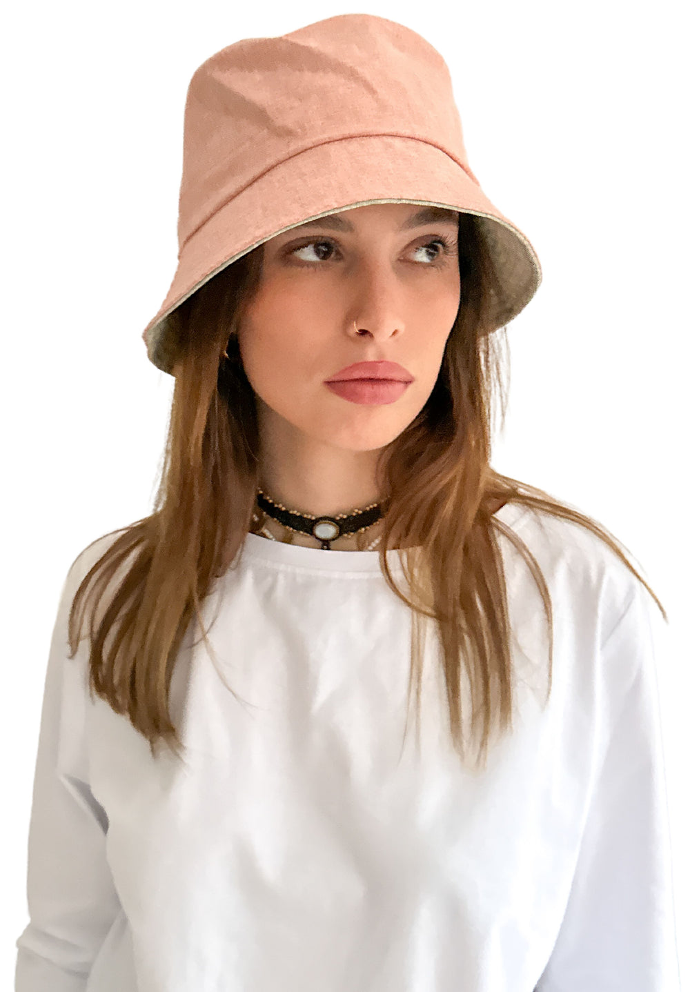Beckie Bucket Hat in Pure French Linen - reversible two colours Sage Peach